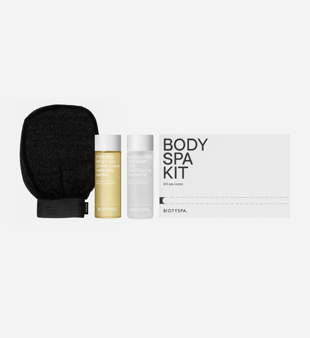 Body Spa Kit está diseñado para eliminar células muertas de la piel y activar la circulación gracias al gel de ducha y guante exfoliante. El aceite ayudará a dar firmeza e hidratación.