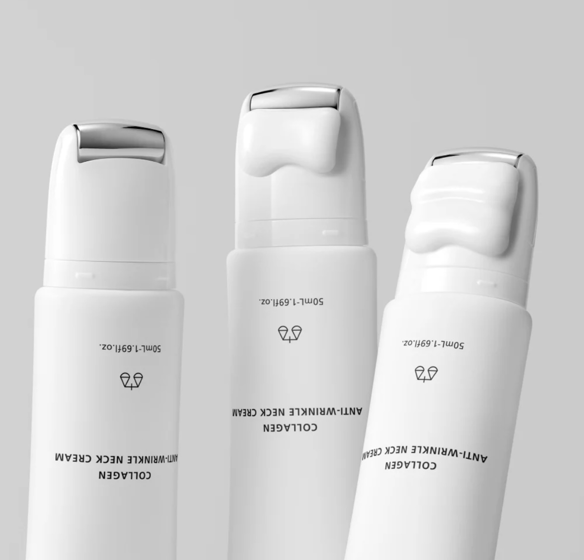 Crema para el cuello que rejuvenece y revitaliza la piel del cuello. Su aplicador de rodillo con colágeno minimiza las líneas de expresión visibles.
