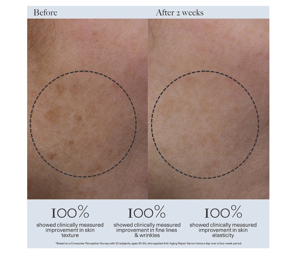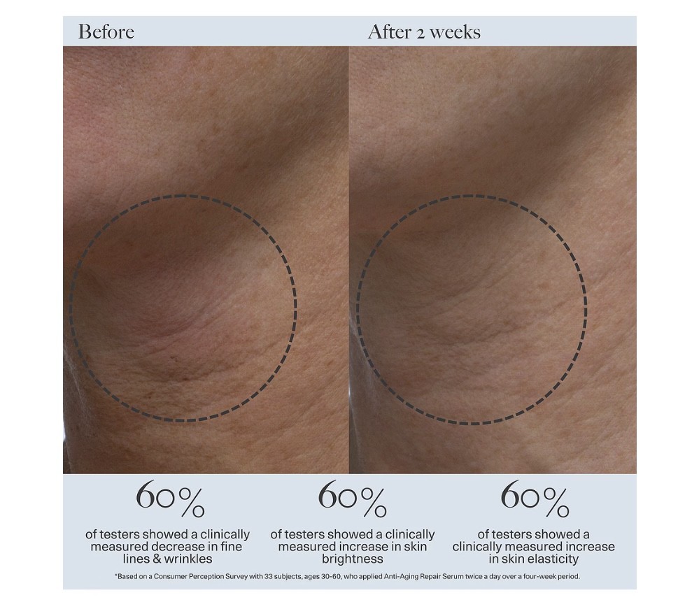 Potente suero antiedad con un 3 % de vitamina C que mejora la apariencia de líneas de expresión y arrugas, a la vez que unifica el tono de la piel y la ayuda a lucir más firme. La vitamina C (ascorbato de tetrahexildecilo), de profunda penetración, protege contra el daño de los radicales libres causados por los rayos UVA/UVB y la contaminación, dejando la piel más luminosa y con un aspecto más juvenil. Dos extractos de algas marinas potencian la hidratación y favorecen el colágeno y la elastina de la piel. Las células madre orgánicas de lila combaten los radicales libres, controlan el exceso de grasa, protegen las células cutáneas del daño UV, inhiben la producción de pigmento y detienen la degradación del colágeno.